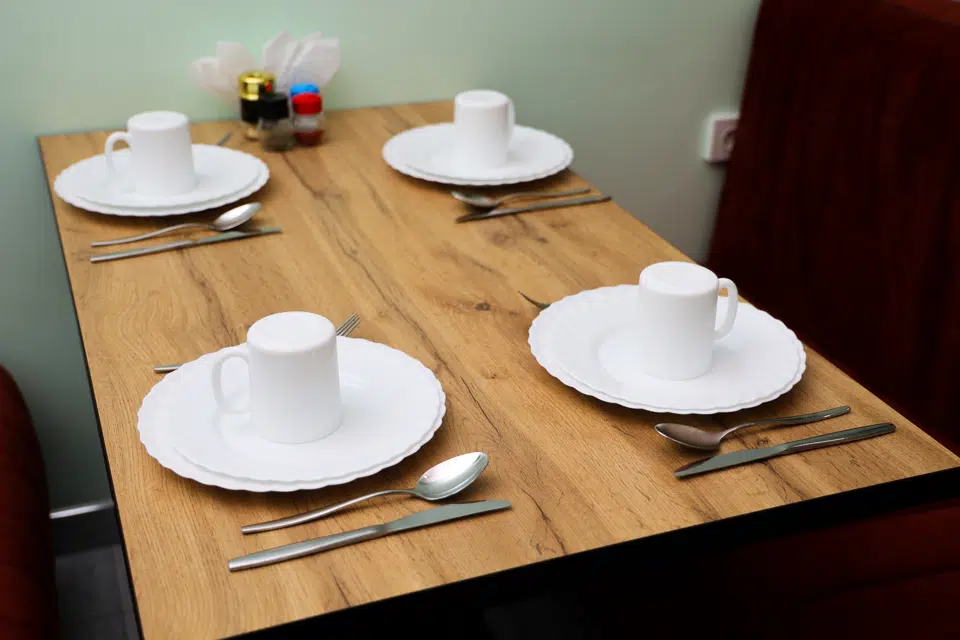 На фото представлена элегантная и уютная столовая Gosty Comfort Hotel — идеальное место для начала дня с аппетитным завтраком. Светло-зелёные стены создают расслабляющую атмосферу, а мягкие диваны насыщенного коричневого цвета располагают к комфортному и приятному пребыванию. На столах уже аккуратно сервированы белоснежные тарелки и столовые приборы, что добавляет утончённости обстановке.